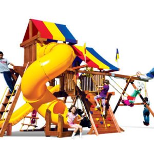 The 19J Rainbow Castle Pkg V swing set takes backyard fun to the next level! With a 5’ 8” deck height, penthouse with a thrilling 360º spiral slide, monkey bars, 360° tire swing, 9’ swing beam height, and a 10.5’ safety scoop slide, this set is packed with adventure. Just try to keep a straight face as your kids spiral down in fits of laughter!