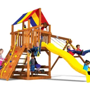 Big fun in a compact design! The 29B Circus Clubhouse is perfect for younger children and smaller yards, featuring a 5’ deck height, 8’ swing beam height, and a 10’ wave slide for endless excitement. Plus, the built-in picnic table creates the perfect spot for snack breaks and creative play. Small but mighty—this set is packed with fun!