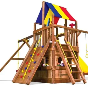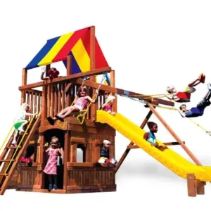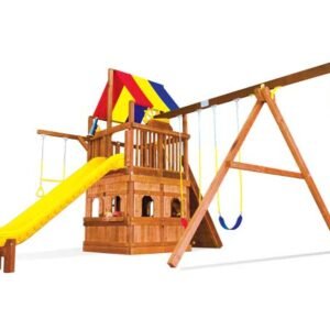 The 37B Rainbow Clubhouse Pkg II takes backyard play to the next level with its built-in lower-level playhouse—a perfect hideaway for endless imaginative adventures. Designed with industry-leading craftsmanship, this swing set features a sturdy 5’ 8” deck height, a 9’ swing beam height for high-flying fun, and a 10.5’ safety scoop slide for a smooth, exciting ride. Whether climbing, swinging, or playing make-believe, this clubhouse creates a world of fun for kids of all ages while fitting comfortably in most yards. Built for adventure. Designed to last.