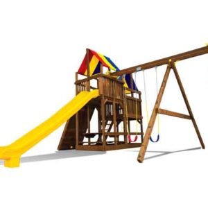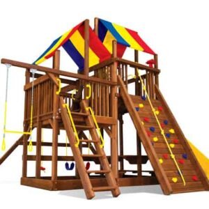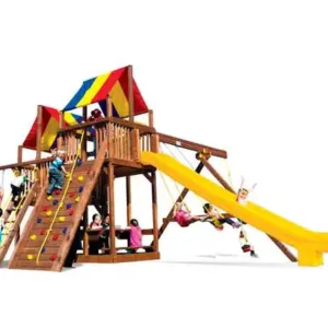 The 44A King Kong Clubhouse Pkg II is a monumental playset, designed for maximum adventure and endless fun! One of the largest in the Rainbow lineup, this impressive swing set features a massive split deck with heights of 7’ 2” and 5’ 6”, providing plenty of space for climbing, exploring, and imaginative play. With a spacious 5.2’ x 10.4’ deck area, a towering 10.5’ swing beam height, and an exhilarating 14’ safety scoop slide, kids will enjoy thrilling outdoor play at every level. Complete with a built-in picnic table and sandbox, this set offers the perfect space for creativity, relaxation, and interactive fun. Plus, with room for exciting customization, you can tailor the playset to fit your child’s interests for a truly personalized backyard adventure. Big, bold, and built for unforgettable fun!