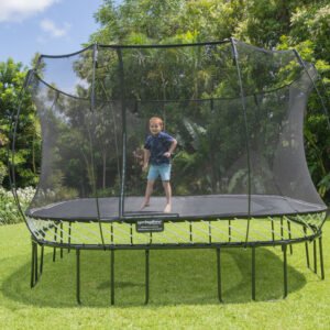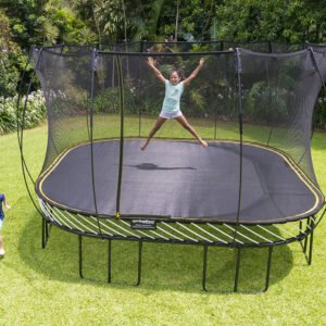 Its unique square-with-rounded-corners design maximizes jumping space, providing the equivalent surface area of a 15′ spring-based trampoline. Whether practicing jumps or just having fun, this trampoline delivers a safe, high-performance bounce—and pairs perfectly with a trampoline basketball hoop for even more excitement!